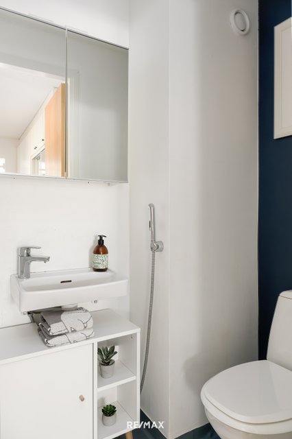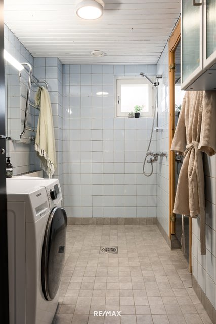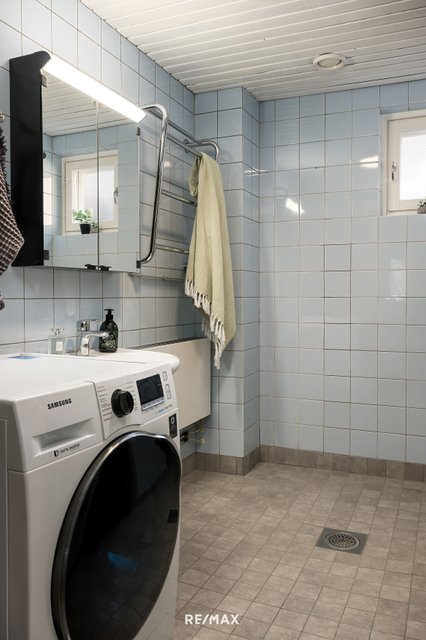 - Suihku, pesukoneliitäntä, peilikaappi, pesuallas, ja patterikuivain