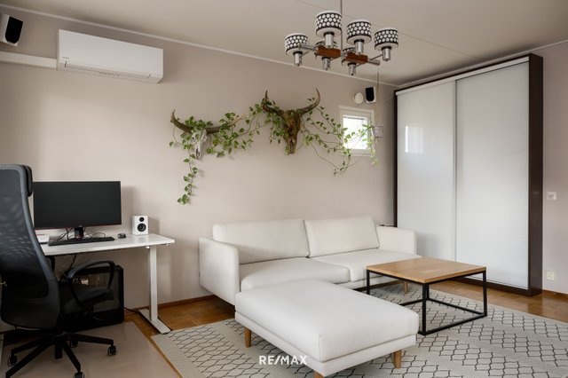 - Tilava olohuone johon asennettu ilmalämpöpumppu. Kulku lasitetulle parvekkeelle.