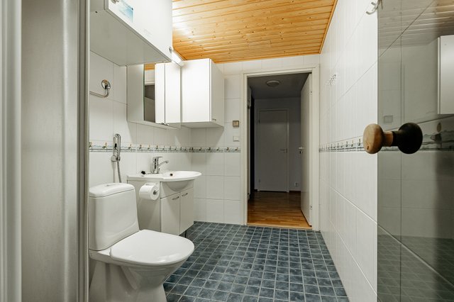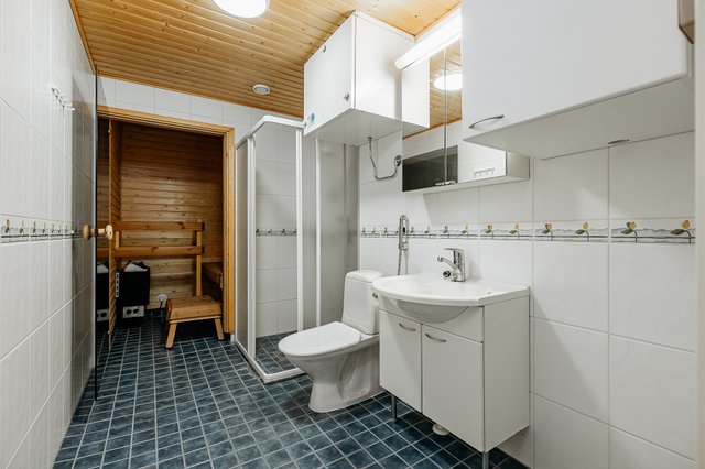 - WC-istuin, suihku, suihkuseinä, lattialämmitys, peilikaappi, ja bidee-suihku