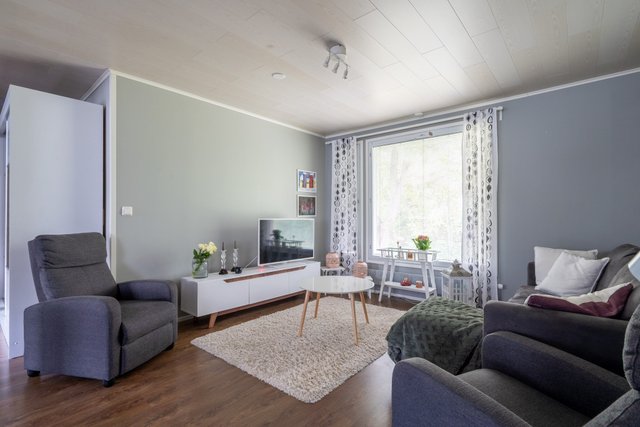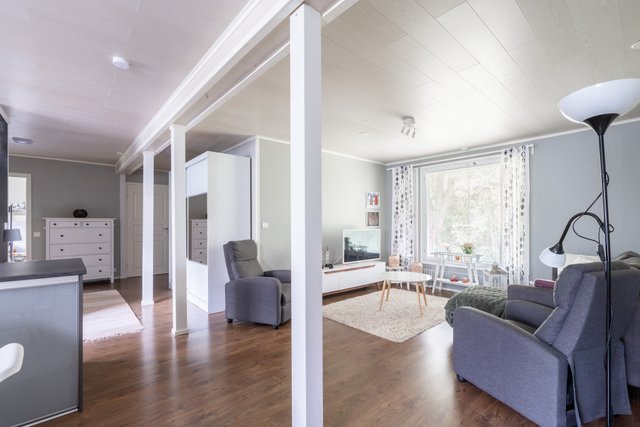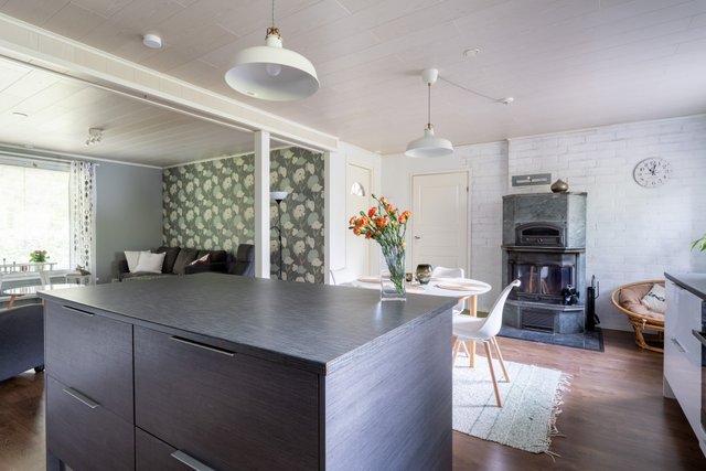Talossa keittiö ja olohuone muodostavat yhtenäisen avoimen tilan, jossa on tunnelmallinen varaava takka. Keittiö on remontoitu vuonna 2014 ja varusteltu nykyaikaisesti, joten ruoanlaitto sujuu vaivattomasti. Kolme makuuhuonetta tuovat tilaa koko perheelle ja kylpyhuone sekä sauna tarjoavat rentoutumishetkiä arjen keskellä.