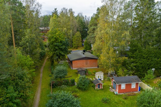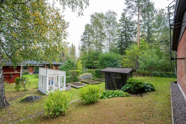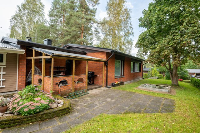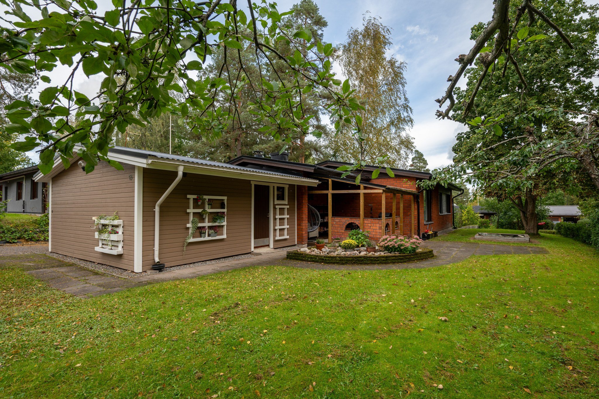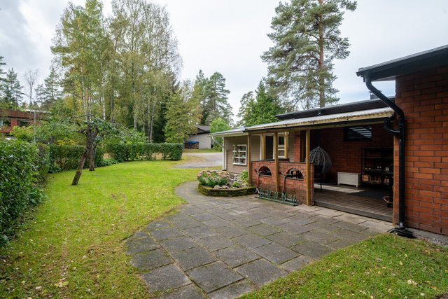 Pihapiirissä on katettu terassi, joka kutsuu nauttimaan kesäpäivistä. Tontin yksi reuna rajautuu metsään, mikä luo rauhallisen ja luonnonläheisen tunnelman. Läheltä löydät myös luontopolkuja ja merenrannan, joten ulkoilumahdollisuudet ovat erinomaiset.