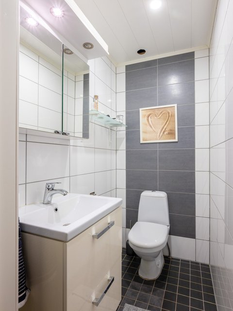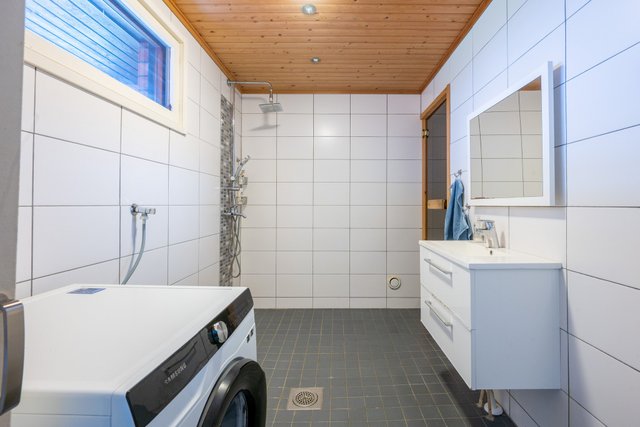 - Suihku, pesukoneliitäntä, allaskaappi, peili, ja lattialämmitys