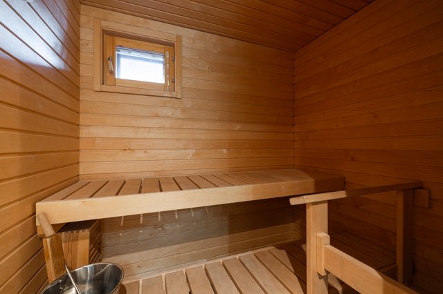 - Ikkunallinen sauna, seinät paneelia, lattia maalattu laatta.