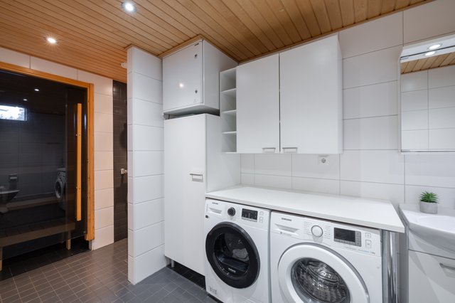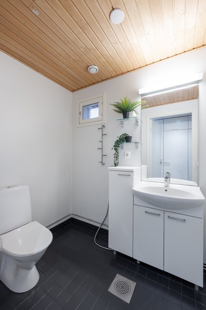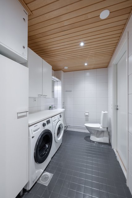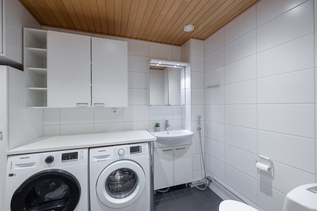 - Kylpyhuone, suihku, laatoitettu suihkuseinä, pyykkikaappi, kaappeja, peilikaappi, allaskaappi, tasoa, pesukoneliitäntä, wc-istuin, lattialämmitys, seinät laatoitettu, tehostelaatoitus maalattu, lattia maalattu laatta.