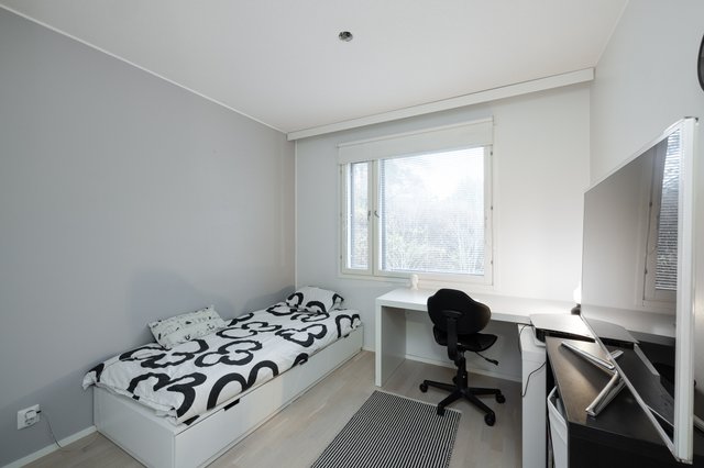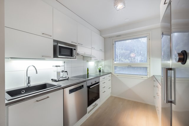 - Kaapistot, täyskorkea jääkaappi (rosteri), täyskorkea pakastekaappi (rosteri), induktioliesi (rosteri) erillisuuni, liesituuletin hormiin (Swego Saga), astianpesukone (rosteri uusittu vuonna 2024). Seinät maali / välitilalaatta, lattia tammi parkettia.