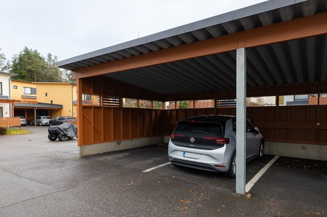 - Jokaiselle huoneistolle kuuluu yksi autokatospaikka, 24 avopaikkaa on yhtiön hallinnassa ja ovat vuokrattavia yhtiöltä.