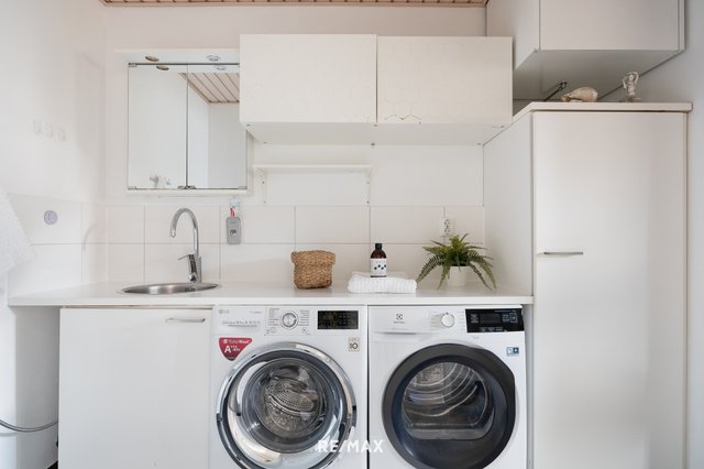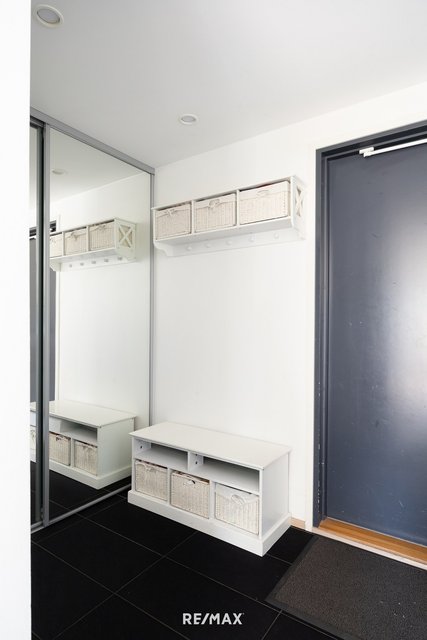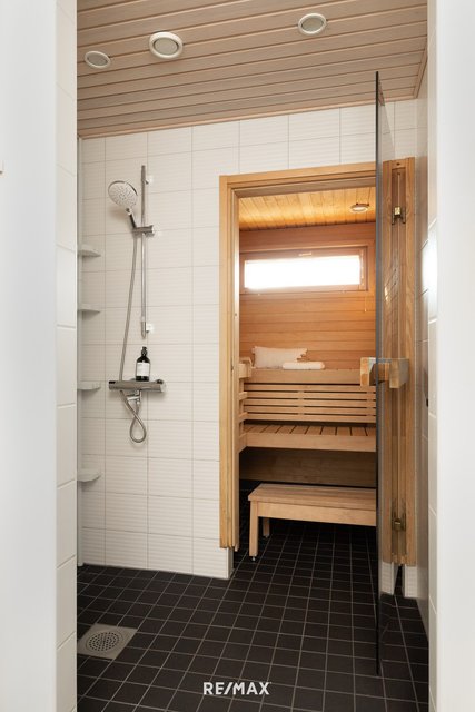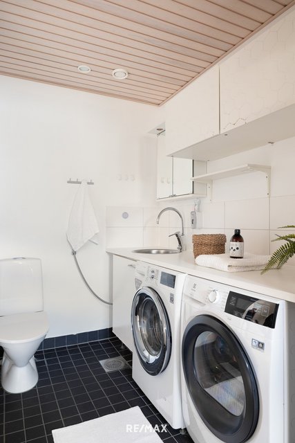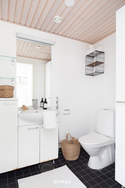 - WC-istuin, suihku, pesukoneliitäntä, lattialämmitys, pesuallas, allaskaappi, bidee-suihku, ja peilikaappi