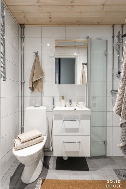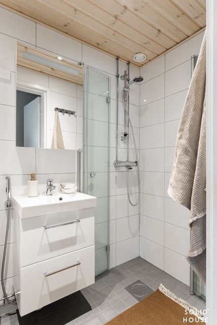 - WC-istuin, suihku, lattialämmitys, pesukoneliitäntä, peilikaappi, allaskaappi, pesuallas, bidee-suihku, suihkuseinä, ja pyyhekuivainpatteri