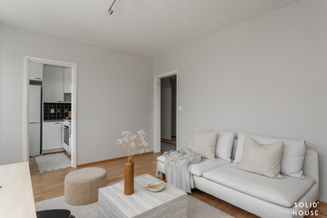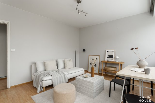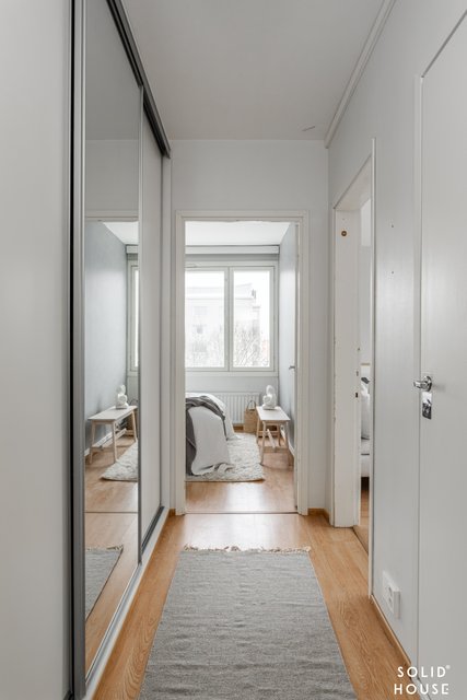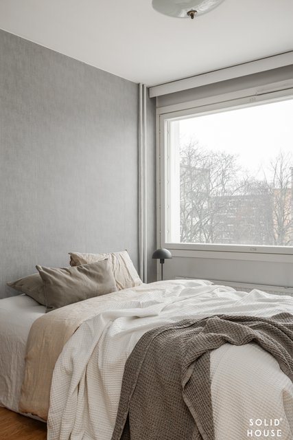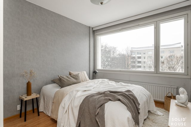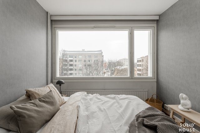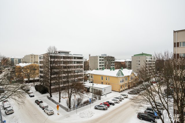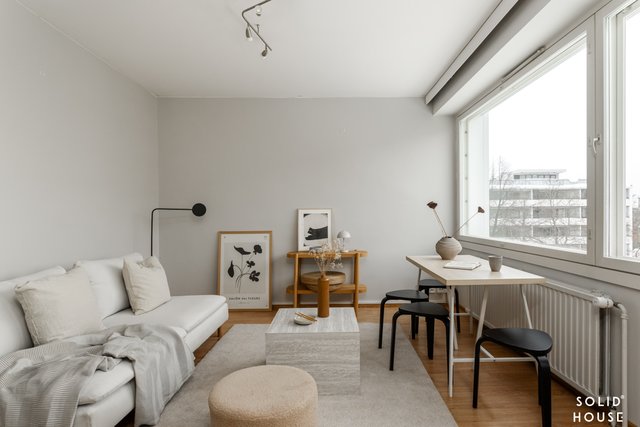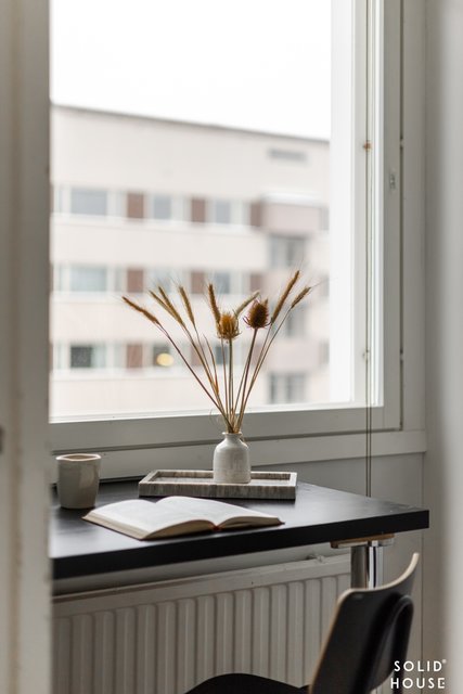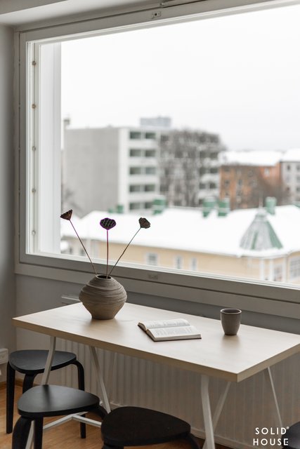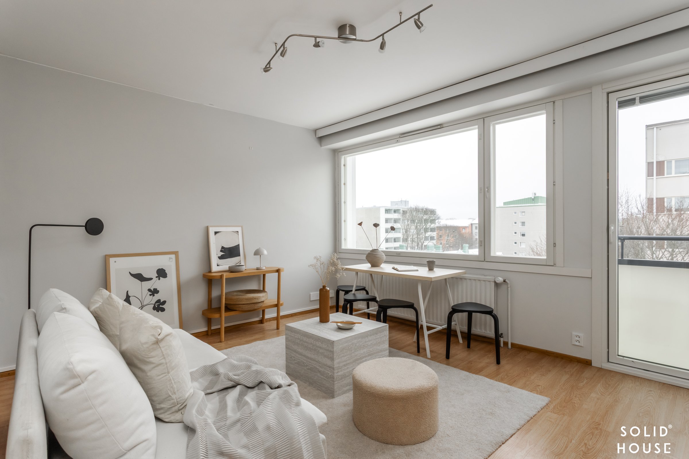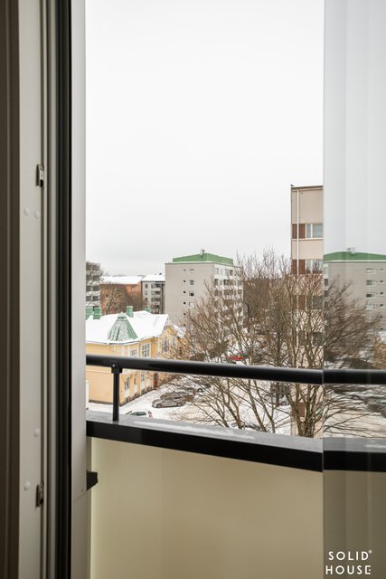 Viehättävyys piilee asunnon pohjaratkaisussa ja ennen kaikkia näkymissä. Kulmassa sijaitsevasta asunnosta on ikkunat kahteen eri suuntaan ja ranskalainen parveke täyslasiovella tuo kokonaisuuteen mukavan lisänsä.