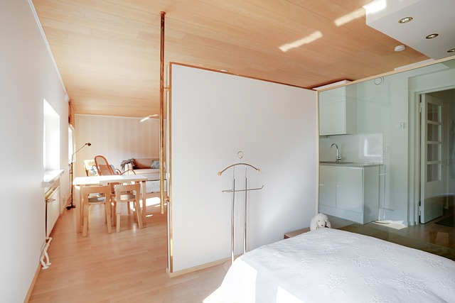 Tämä huoneisto on virallisesti yksiö, mutta makuutila on erotettu näppärästi kevytrakenteisella tilanjakajalla oleskelutiloista.
