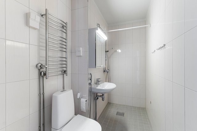 - Suihku, wc-istuin, peilikaappi, pesukoneliitäntä, ja kiinteät valaisimet