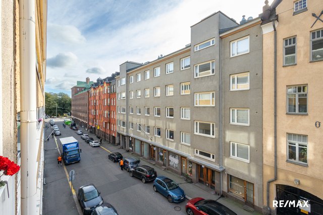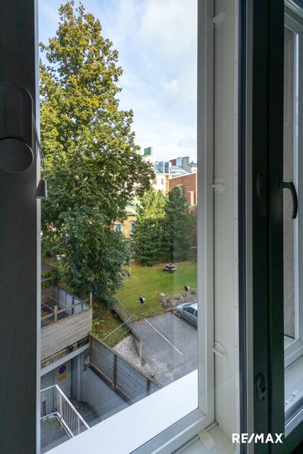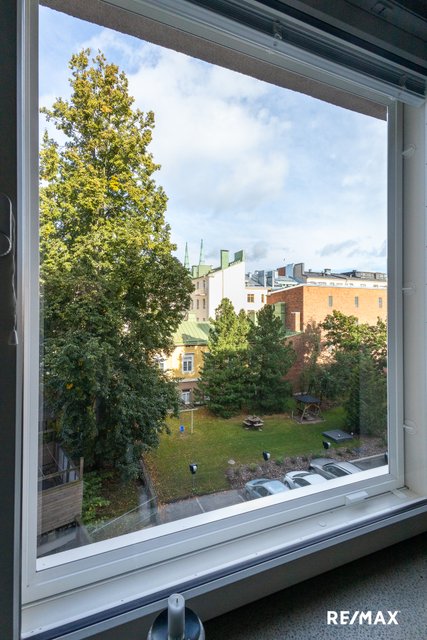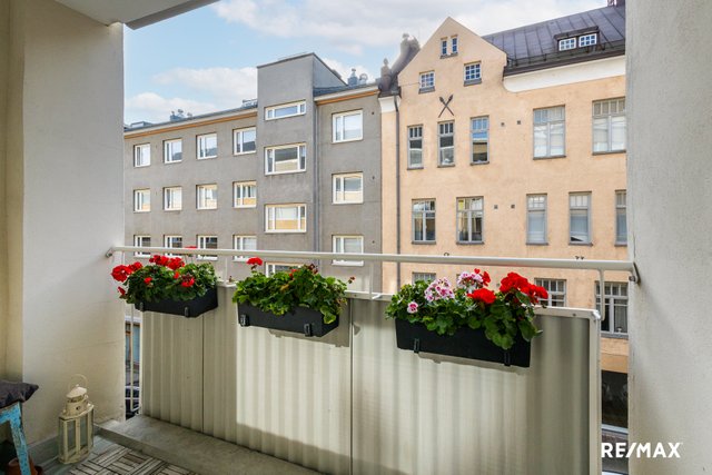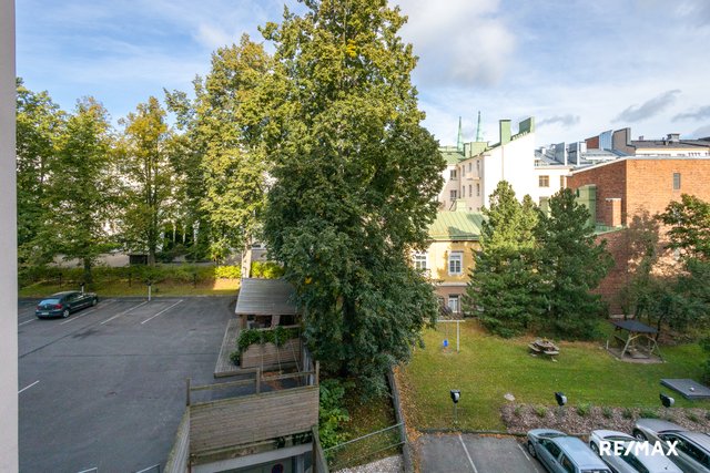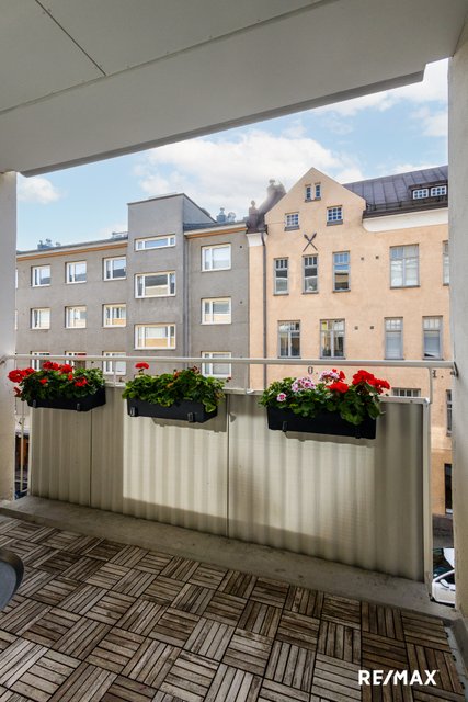 - Parvekeelta katunäkymä etelään Vuorimiehenkadulle, keittiöstä ja makuuhuoneesta pihanäkymä pohjoiseen