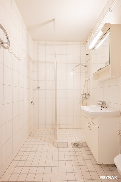 - Suihku, peilikaappi, allaskaappi, pesukoneliitäntä, wc-istuin, Lattia: laatta, Seinät: laatta.