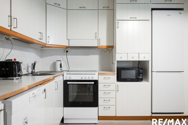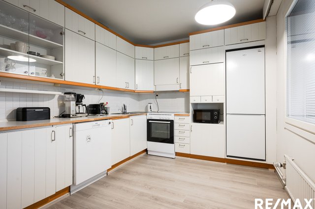 - Kaapistot, uuni, liesi, mikro, liesituuletin, integroitu uuni, Lattia: laminaatti, Seinät: maalattu. Jääkaappi, liesi ja tiskikone uusittu 2023.