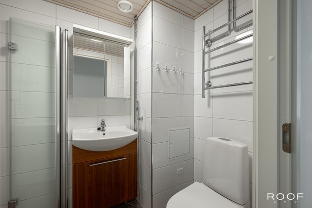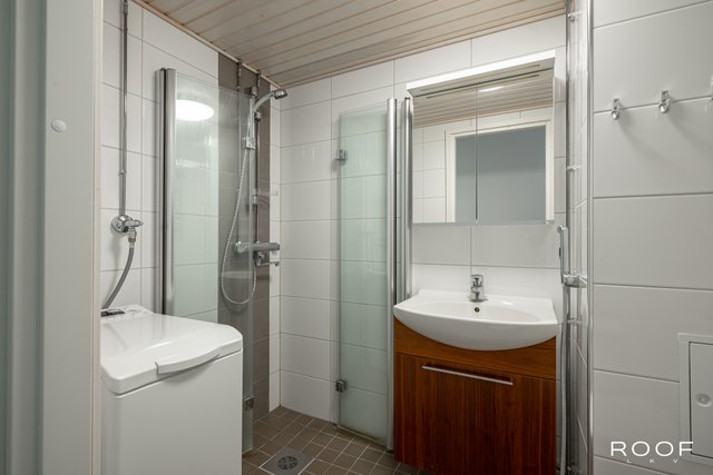- WC-istuin, suihku, suihkuseinä, pesukoneliitäntä, peilikaappi, bidee-suihku, pesuallas, allaskaappi, ja rättipatteri