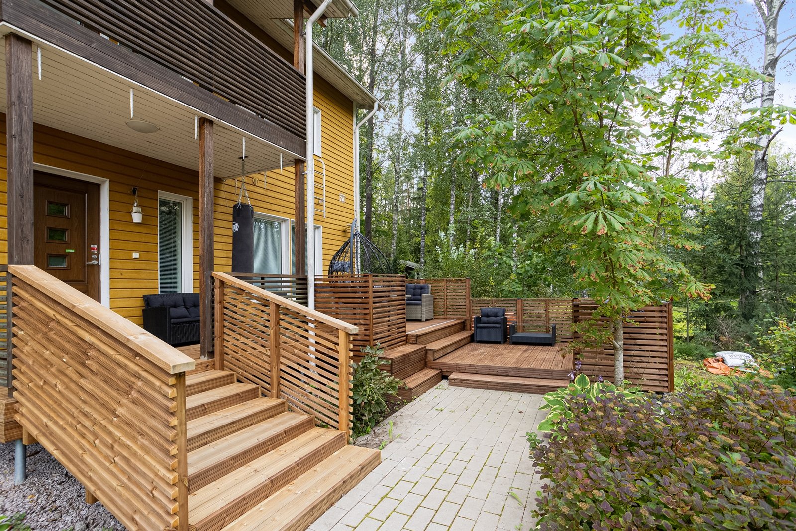 Yläkerran aula tarjoaa monikäyttöistä tilaa, ja parvekkeet tarjoavat mahdollisuuden nauttia ulkoilmasta. Talossa on myös useita säilytystiloja, kuten vaatehuoneita ja ulkovarasto. Pihapiiri on siisti ja kivetyt pihatiet tekevät siitä helppohoitoisen.