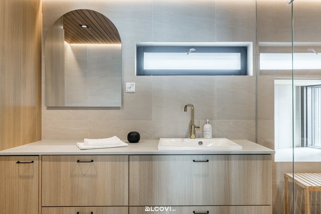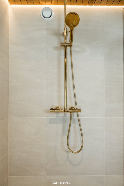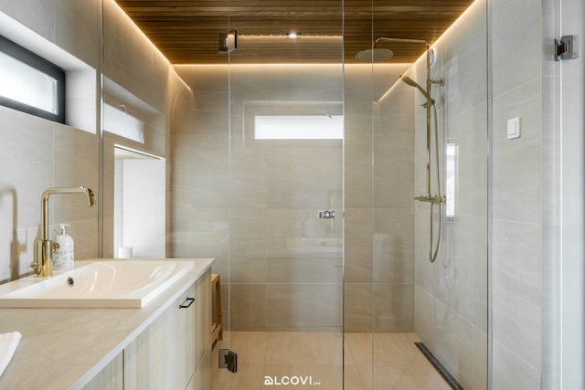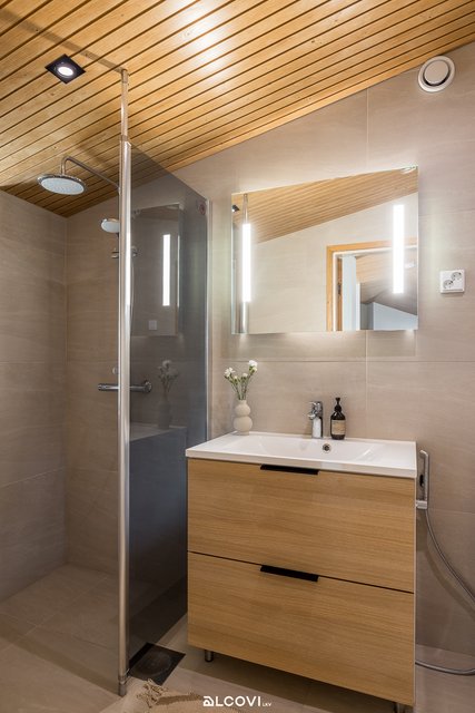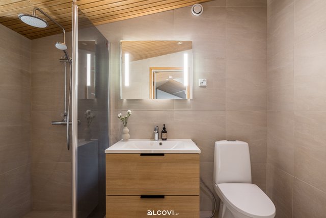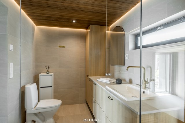 - Kylpyhuoneita on 2 kpl, lisäksi saunaosasto. Keskikerroksen kylpyhuoneen varustukseen kuuluu allaskaappi ja seinäkaappia (Inno-keittiö), valaistu peili, sadesuihku, lasinen suihkuseinä, wc-istuin ja bidee-suihku, lisäksi pyyhekoukut ja lattialämmitys (sähkö). Lattia ja seinät on laattaa. Yläkerran kylpyhuoneen varustukseen kuuluu allaskaappi (Inno-keittiö), valaistu peili, sadesuihku, wc-istuin, bidee-suihku ja lattialämmitys (sähkö). Lattia ja seinät on laattaa.