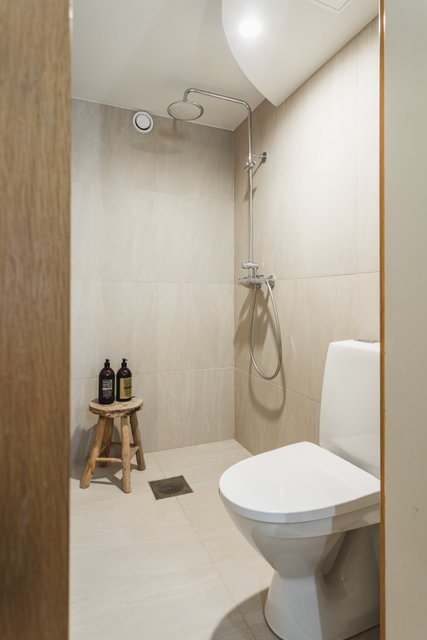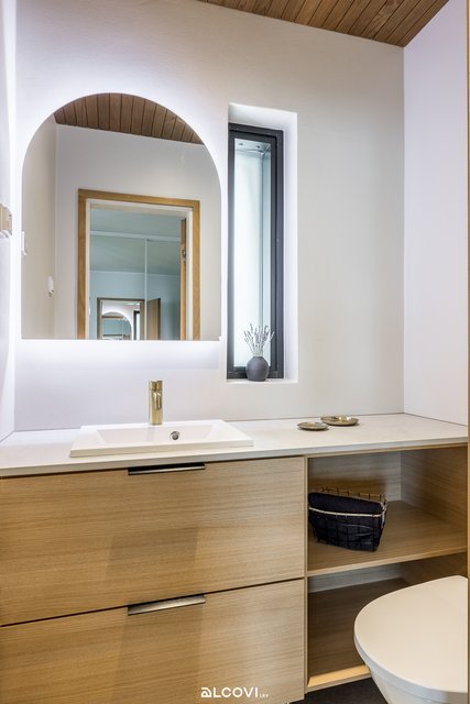 - Erillinen wc sijaitsee keskikerroksessa, eteisen yhteydessä. Varustukseen kuuluu allaskaappi (Inno Keittiöt), valaistu peili, wc-istuin ja bidee-suihku. Lattia on laattaa, seinät maalatut. Saunaosastolla on toinen erillinen wc.