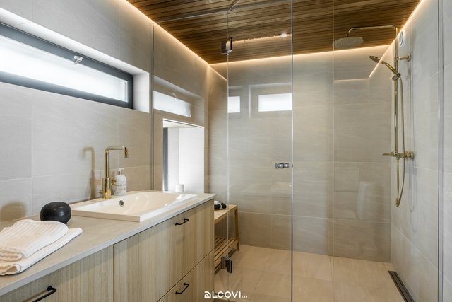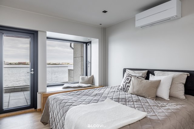 - Eteisen lattia on laattaa, seinät maalatut. Tilava peililiukuovikaapisto (Inno-keittiö). Ruokailutilan lattia on parkettia, seinät maalatut, kasettikatto. Näkymät merelle. Kulku parvekkeelle. Vaatehuoneen lattia on laattaa, seinät maalatut. Avohyllyä, tankoa. Varasto-/ullakkohuoneiden (2 kpl) lattiat ovat parkettia, seinät ja katot maalatut. Sijainti yläkerrassa. Yläkerran aulan lattia on parkettia, seinät maalatut, rimakatto. Kulku parvekkeelle. Ilmalämpöpumpun sisäyksikkö. Sivuasunto: 1-2h+avok+kph+pk/khh. Avokeittiön (Inno-keittiö) varustukseen kuuluvat integroidut kodinkoneet: induktioliesitaso, liesituuletin, kalusteuuni, mikroaaltouuni, astianpesukone ja jääkaappi-pakastin. Lattia on laattaa, seinät maalatut. Olohuoneen lattia on parkettia, seinät maalatut. Suuri lasiliukuovi meren suuntaan, josta kulku terassille. Makuutilan lattia on parkettia, seinät maalatut. Kulku kylpyhuoneeseen. Pukuhuoneen/khh:n varustukseen kuuluu allaskaappi (Inno-keittiö), valaistu peili, pyykinpesukoneliitäntä, tilavaraus pesutornille ja kaapistoa. Lattia on laattaa, seinät maalatut. Erillisenä tilanaan on kylpyhuone, jonka varustukseen kuuluu sadesuihku ja wc-istuin. Lattia ja seinät on laattaa. Lattialämmitys (sähkö).