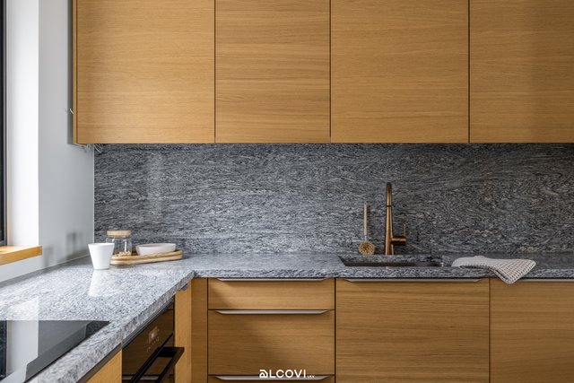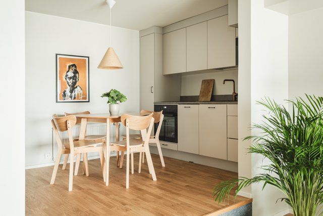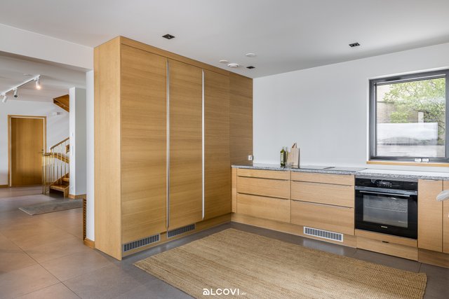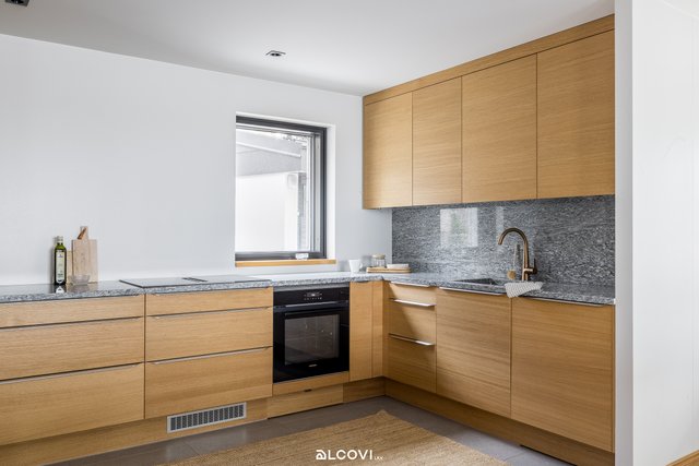 - Keittiön (HTH-Keittiöt) varustukseen kuuluvat integroidut kodinkoneet: induktioliesitaso integroidulla liesituulettimella, kalusteuuni, astianpesukone, jääkaappi ja pakastin. Aamiaiskaappi, saareke. Työtasot on kiveä. Lattia on laattaa, seinät maalatut.