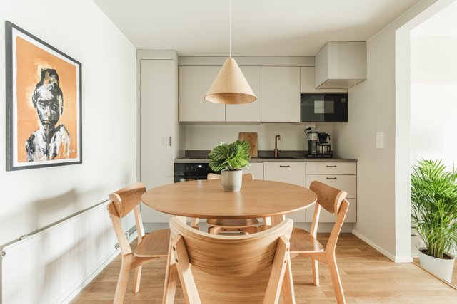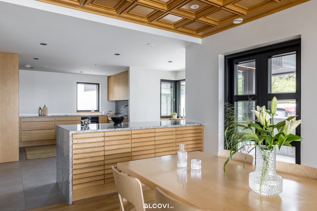 Keittiössä kohtaavat tammen lämmin sävy, kivitasojen ajattomuus ja huippuluokan kodinkoneet. Saareke, aamiaiskaappi sekä korkeatasoinen toteutus tekevät siitä ruoanlaitosta nauttivan unelman. Avara ruokailutila sijoittuu meren suuntaan ja tarjoaa puitteet isommallekin seurueelle.