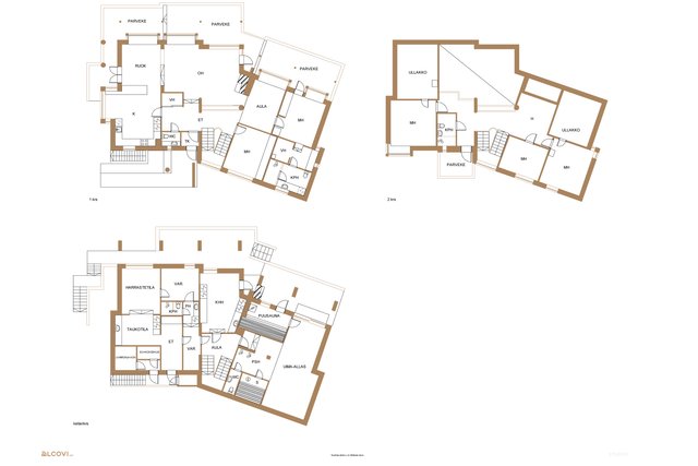 - Yhtiöjärjestyksen mukaiset huoneistojen pinta-alat on 215 m2 ja 148 m2. Pinta-aloja ei ole tarkistusmitattu. Asuinrakennuksen asuintilojen pinta-ala on arkkitehdin kerrosalakaavion mukaan yhteensä noin 387 m2 sisältäen 1. ja 2. kerroksen asuintilat sekä kellarin tilat. Kerrosala on 279 k-m2 ja kokonaisala 472 m2. Asuintilat ja muut tilat on eritelty esitteellä, ja ne perustuvat yhtiöjärjestykseen, rakennuslupapiirustuksiin ja arkkitehdin kerrosalakaavioon. Autotallin kerrosala on 48 k-m2. Mainitut pinta-alat saattavat tämän ikäisessä kohteessa (rak. ennen vuotta 1992) poiketa olennaisesti nykyisten standardien mukaan laskettavasta asuinpinta-alasta.