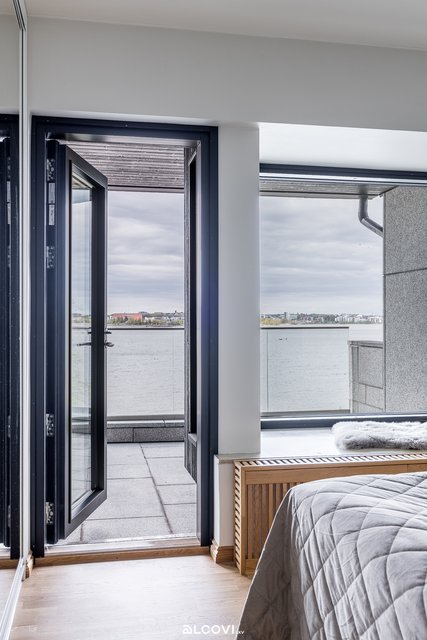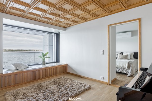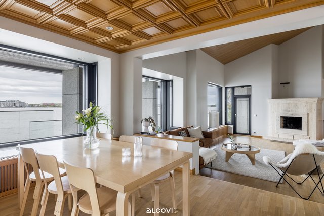 - Olohuoneen lattia on parkettia, seinät maalatut, rimakatto. Katossa epäsuora led-valaistus, lisäksi led-valaisimet. Takka. Näkymä merelle. Kulku katetulle parvekkeelle.