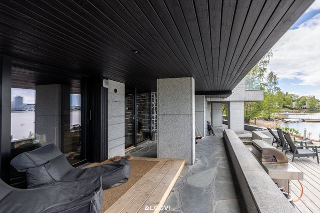 - Suuri, porrastettu terassialue, jossa upotettu ulkoporeallas (Novitek). Terassi on osin katettu. Ulkotakka. Oma ranta ja laituri. Koko huoneiston levyinen katettu parveke, jossa lasikaiteet ja näkymä merelle. Etupihan puolella katettu parveke, johon on kulku yläkerran aulasta. Kulkuväylät ja pysäköintialue on kivetty, muutoin nurmea ja terassia. Useita istutusaltaita.