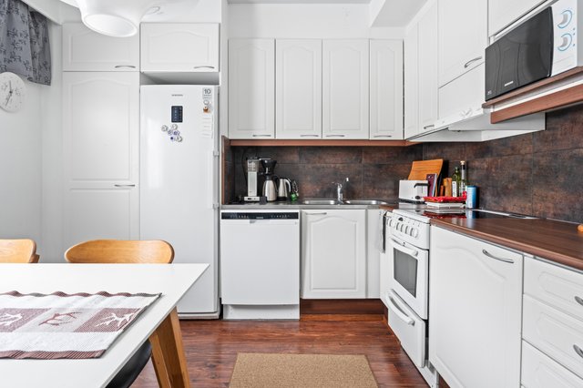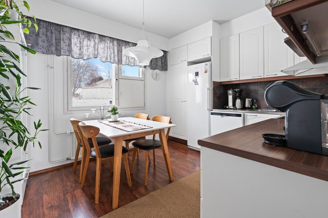 - Siisti keittiö, jossa uusittu kaapistojen ovet, pöytätasot sekä seinät ja lattia uusittu vuosien 2007-2013 välisenä aikana. Vaihdettu uudet matalalinjaiset loisteputkivalaisimet valolistojen taakse 2010, keittiön jääkaappi uusittu 2012, astianpesukone 2024 , liesi ja liesituuletin 2007