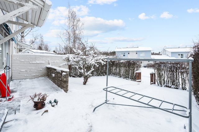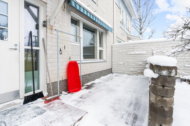 Omalla, pensasaidalla rajatulla pihalla sijaitsee noin kahdeksan neliömetrin patio, jota reunustaa Lakan Betonin kivimuuri. Pihapiiri tarjoaa viihtyisän oleskelualueen sekä vehreyttä – omalla pihalla kasvaa hyvin satoa tuottava luumupuu sekä muuta istutusta. Taloyhtiön suojaisella pihalla on omenapuita sekä lapsille hiekkalaatikko ja liukumäki.