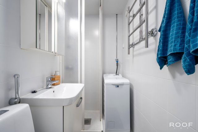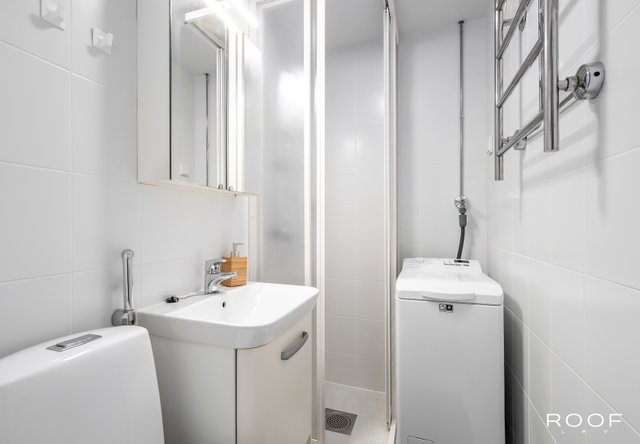 - WC-istuin, suihku, suihkuseinä, pesukoneliitäntä, peilikaappi, ja allaskaappi