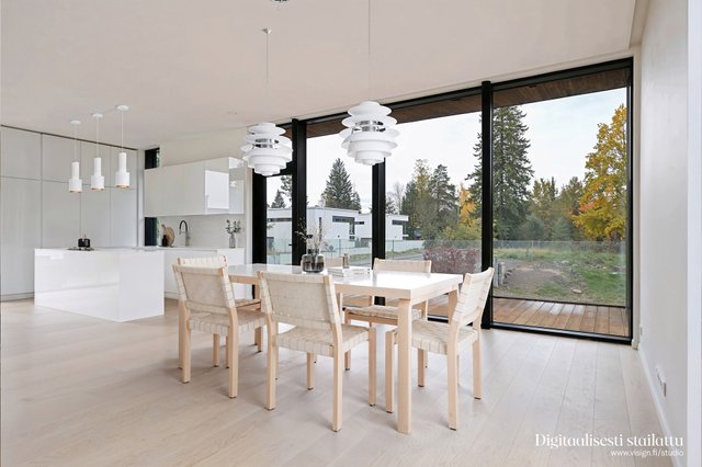 - Suuri valoisa ja avara olohuone suurilla ikkunoilla. Romanoff Lattioiden yksisäleinen tammiparketti Boen Oak Andante Live Matt White. Sähköverhot optiona.