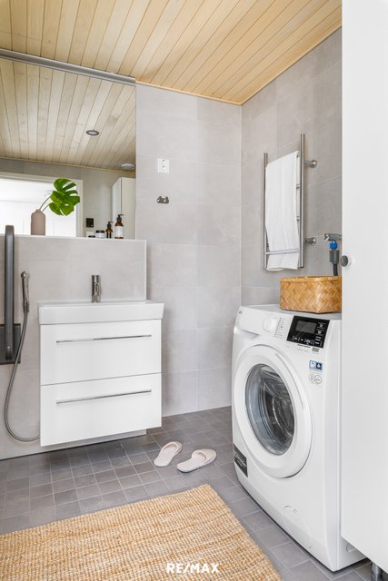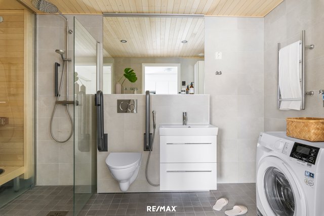 - WC-istuin, suihku, pesukoneliitäntä, pesukone, lattialämmitys, peili, bidee-suihku, pesuallas, allaskaappi, suihkuseinä, ja pyyhekuivain