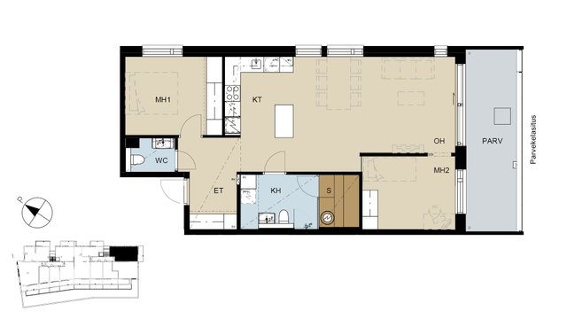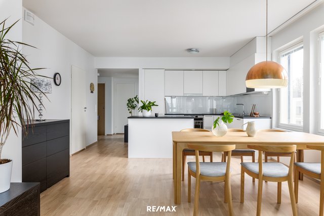 Avara olohuone ja avokeittiö muodostavat kodin sydämen, jossa on tilaa niin arkeen kuin juhlaan. Keittiö on varustettu nykyaikaisilla integroiduilla kodinkoneilla ja laskutilaa on riittävästi saarekkeen myötä. Lasitetulta parvekkeelta avautuu näkymä sisäpihalle kaakkoon, tarjoten rauhallisen paikan nauttia aamukahvista tai auringosta.vAsunnossa on kaksi makuuhuonetta, joista toinen suurempi masterbedroom. Oma sauna Harvian sähkökiukaalla tarjoaa rentouttavia hetkiä arjen keskellä. Kylpyhuone on varustettu lattialämmityksellä ja modernilla laatoituksella, mikä tekee siitä erityisen miellyttävän. Asunnossa on myös erillinen wc.