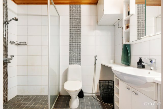 - WC-istuin, suihku, suihkuseinä, peilikaappi, pesuallas, allaskaappi, bidee-suihku, ja lattialämmitys
