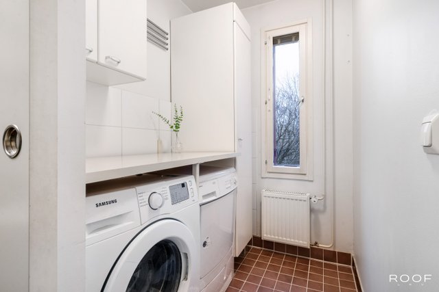 - Lattiakaivo, pyykkikaapit, pöytätaso, tila pesutornille, pesukoneliitäntä, ja lattialämmitys