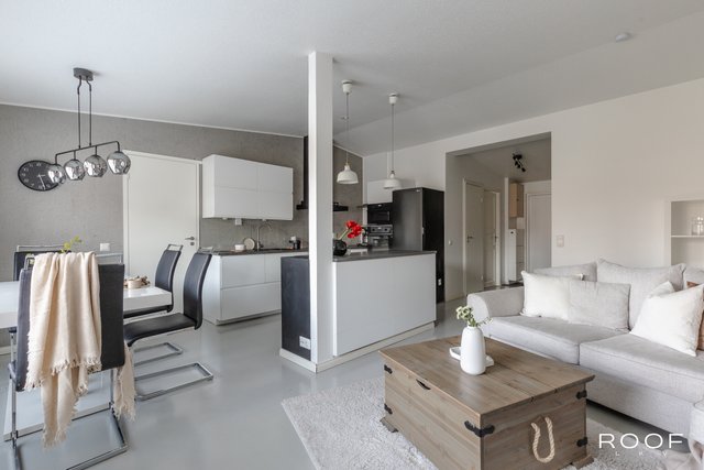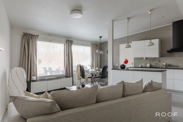 Tässä on toimiva ja viihtyisä rivitalokoti sinulle, joka arvostat tilaa, avaruutta ja valoa. Olohuone ja keittiö ovat yhtä tilaa ja korkeat harjansuuntaiset katot lisäävät tilan tuntua. Isot ikkunat tulvivat valoa sisään. Olohuoneessa on myös takkavaraus, eli saat halutessasi asennuttaa takan tuomaan tunnelmaa. Nykyaikainen ja tyylikäs keittiö houkuttelee kokkailemaan yhdessä kaikenlaisia herkkuja.