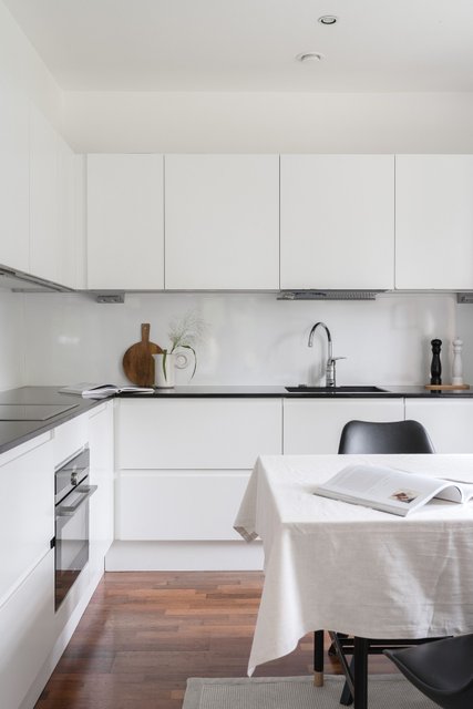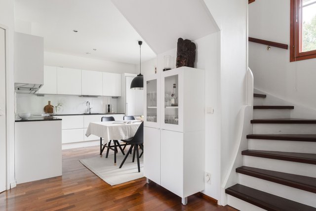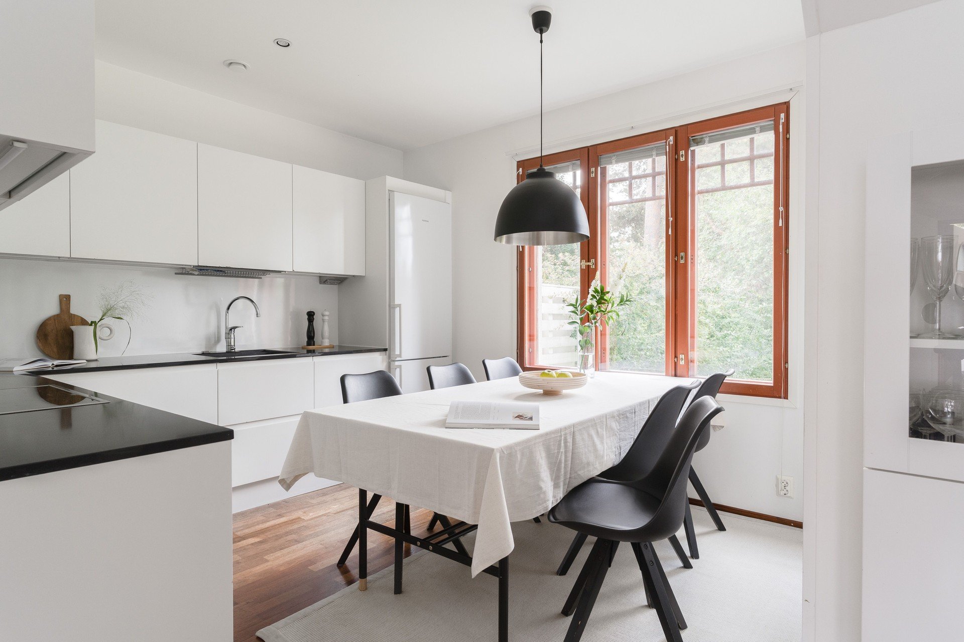 Keittiön laadukkaat materiaalit, kuten kivitaso ja integroidut kodinkoneet, yhdistyvät toimivuuteen ja tyylikkyyteen. Se tarjoaa erinomaiset puitteet niin arjen kokkailuun kuin yhteisiin illallisiin.