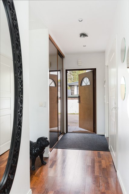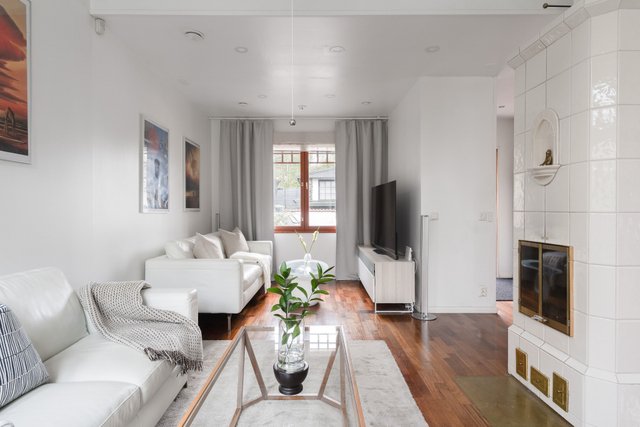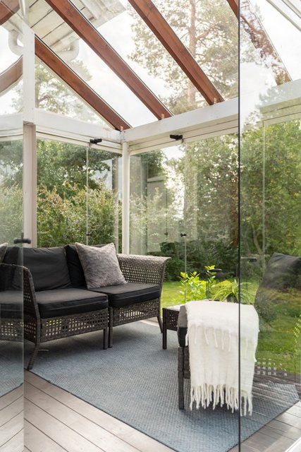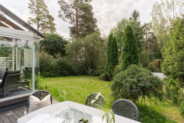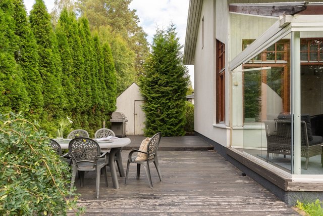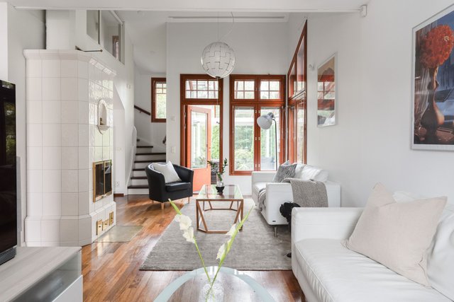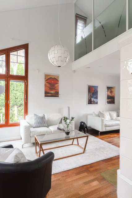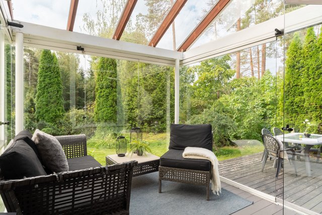 Olohuoneen korkea huonekorkeus ja suuret ikkunat luovat vaikuttavan, avaran ilmeen, jossa valo tulvii sisään kolmesta ilmansuunnasta. Varaava takka tuo tunnelmaa ja lämpöä. Olohuoneesta on käynti lasitetulle terassille, jonka jatkeena avautuu tilava ja kaunis piha-alue – täydellinen paikka niin kesäjuhlille kuin rauhallisille kahvihetkille.