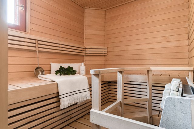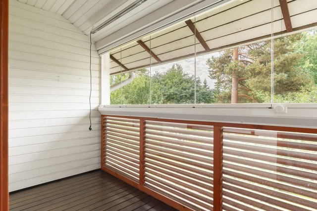 Pohjaratkaisu on huolellisesti suunniteltu: alakerrasta löytyy olohuone, keittiö, yksi makuuhuone, käytännöllinen kodinhoitohuone sekä erillinen wc. Yläkerrassa sijaitsee toinen makuuhuone, vaatehuone, varastohuone sekä n. 10m2 parvi, joka on otettu makuuhuonekäyttöön. Käytännöllisyyttä lisäävät kaksi wc:tä ja runsaasti säilytystiloja – sekä sisällä että erillisessä ulkovarastossa. Yläkerran saunaosasto tarjoaa arkeen ripauksen luksusta, ja päämakuuhuoneesta on kulku lasitetulle parvekkeelle.