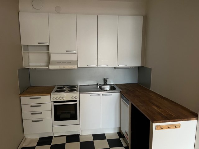 Olohuoneen jatkeena oleva keittiö on toimiva ja siellä on kaikki tarvittavat kodinkoneet , kuten astianpesukone.