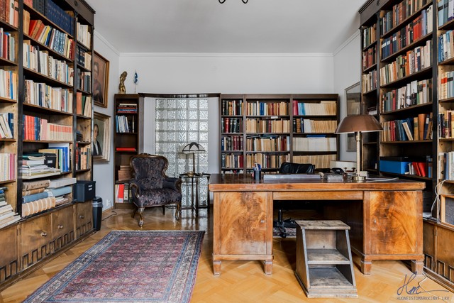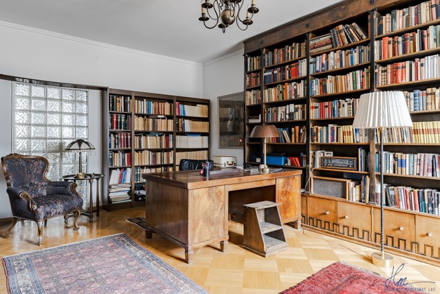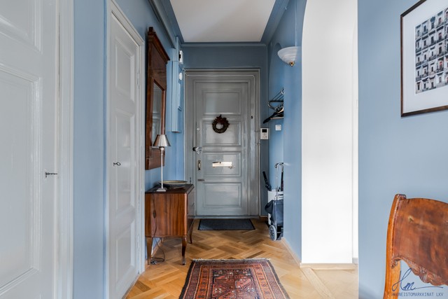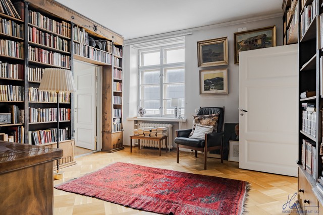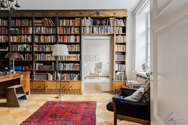 - Kirjastohuone, missä kiinteää kirjahyllyä. Lattia parkettia. Eteinen. Toinen asunnon sisäänkäynneistä keittiössä. Käytävällä liukuovikaapistoja, lattia korkkia.
