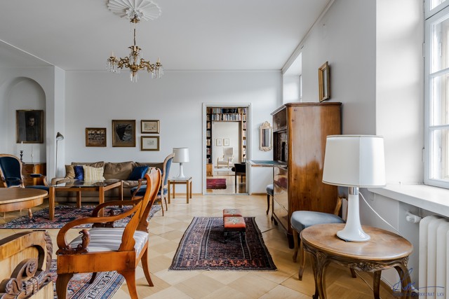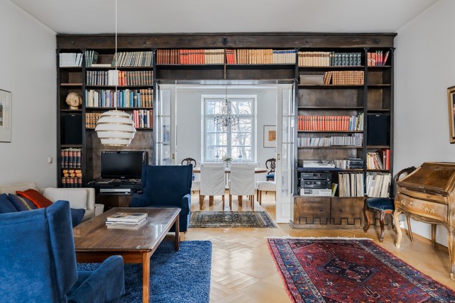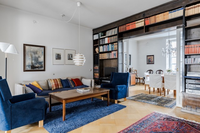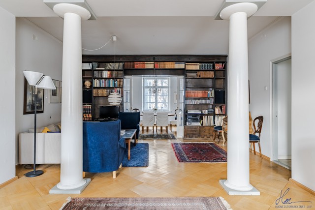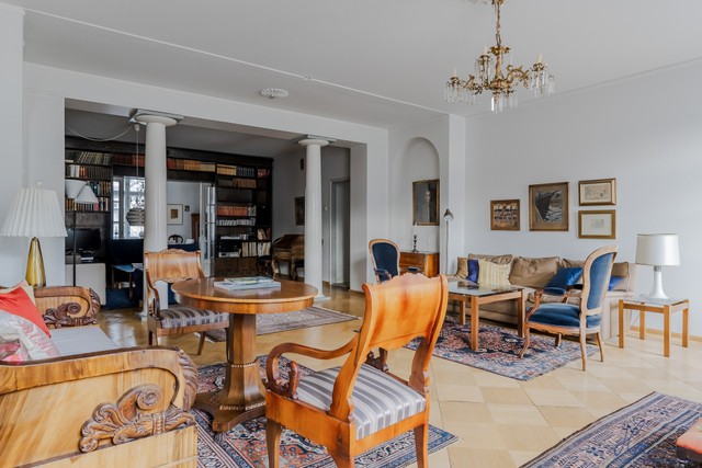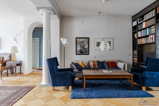 - Iso olohuone huoneiston keskellä, jatkuu ruokasalina läpitalon. Elegantit pylväät. Lattia parkettia, hiottu ja lakattu 90-luvulla. Seinät maalia ja osittain tapettia, kiinteää kirjahyllyä.