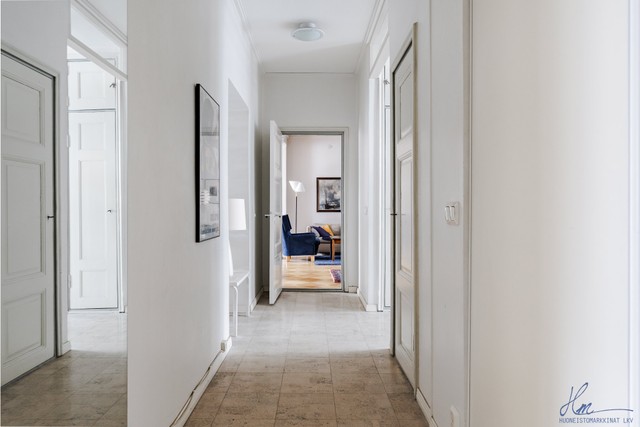 Alkuperäiseltä omistajasuvulta vapautuva asunto kätkee sisäänsä upeita yksityiskohtia ja monimuotoisia tiloja. Avaraa tilaa avautuu keskellä huoneistoa, kun läpitalon kulkevat salit yhdistyvät eleganttien pylväiden harmoniassa. Asunnosta löytyy kaksi salia, kaksi makuuhuonetta, kirjastohuone, iso keittiö omalla sisäänkäynnillä, kylpyhuone sekä kaksi erillistä wc-tilaa. Pohjaratkaisu ja neliöt antavat mahdollisuuden muokata huoneet persoonallisesti omalle perheellesi sopivaksi. Atriumissa asuminen on erityisen huoletonta, kiitos edullisen vastikkeen.