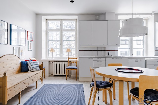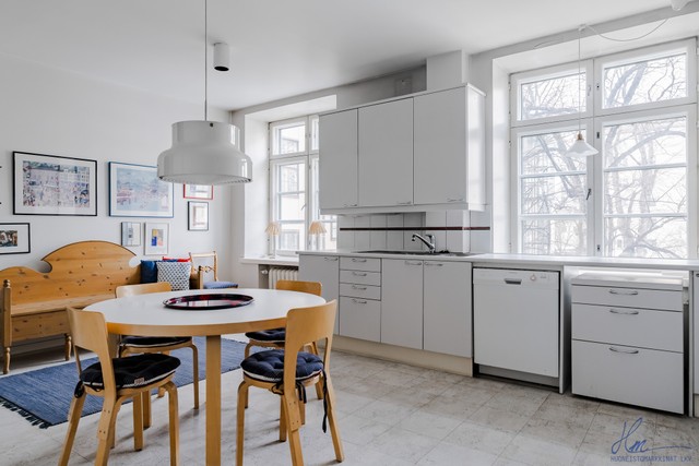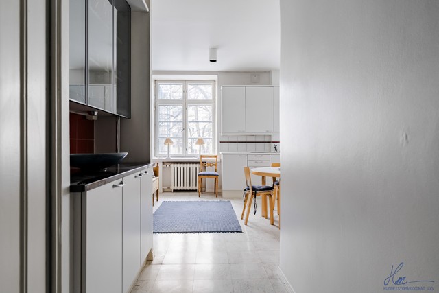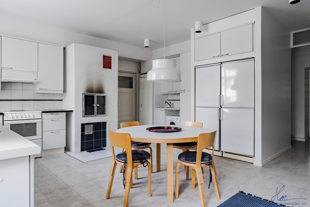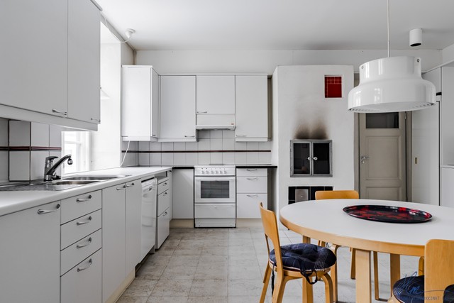 - Vaalea kaapisto. Työtasot kiveä ja melaniinia. Jää-pakastinkaappi, jää-viileäkaappi. Keraaminen liesi, liesituuletin. Astianpesukone. Myyjä ei ole asunut huoneistossa ja huoneisto on ollut asumaton useita kuukausia, joten kodinkoneiden toimivuudesta ei ole tietoa. Seinät maalattu, lattia korkkia. Takka vaihdettu 90-luvulla vanhan puuhellan tilalle. Toinen huoneiston sisäänkäynneistä, käynti rappukäytävän kautta sisäpihalle.