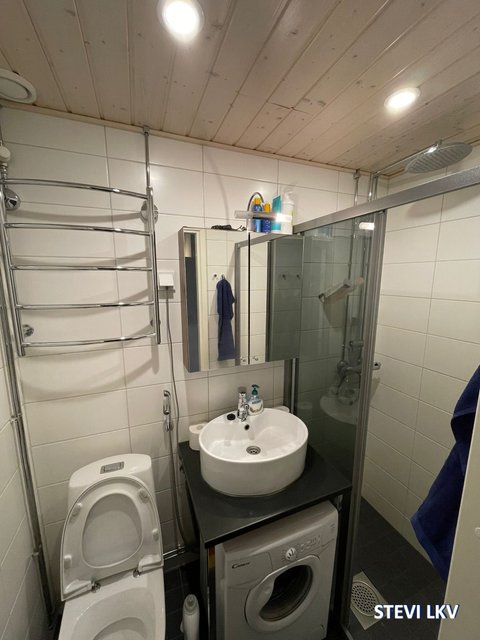 - WC-istuin, suihku, suihkuseinä, pesukoneliitäntä, peilikaappi, bidee-suihku, ja lattialämmitys
