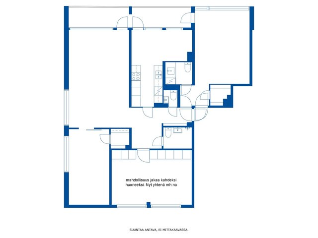 - Huoneistoon on kaksi erillistä sisäänkäyntiä porraskäytävästä. Mahdollista eriyttää tai käyttää toista tilaa esimerkiksi toimisto- tai vastaanottotilana.
