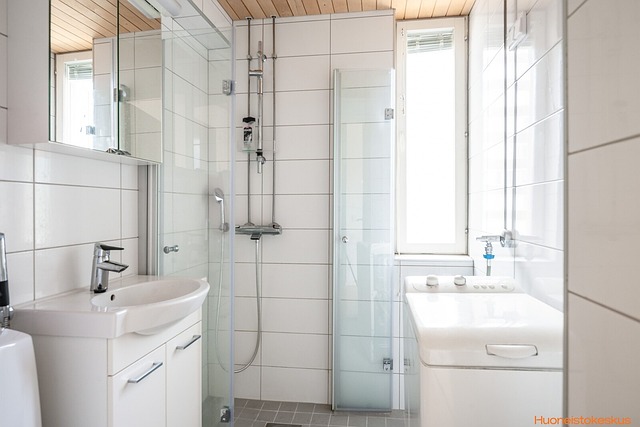Taloyhtiössä putkiremontti tehty, joten kylpyhuone on erinomaisessa kunnossa ja ikkuna tuo mukavasti luonnonvaloa.