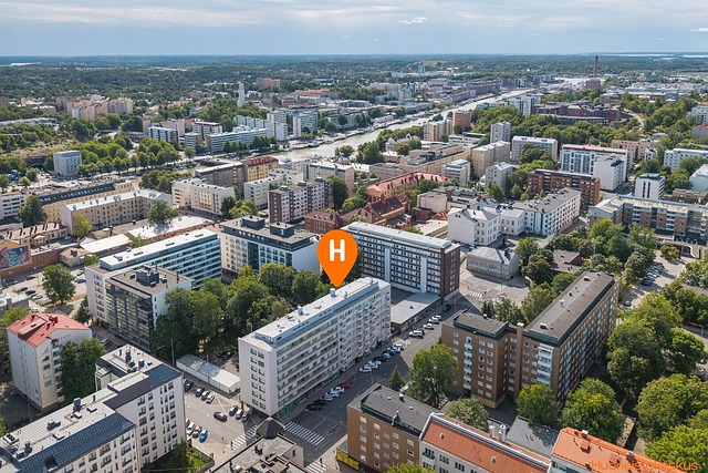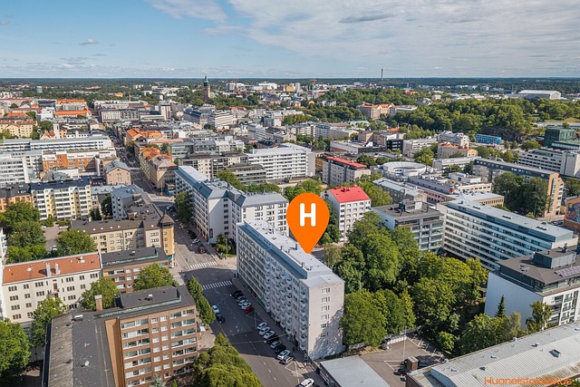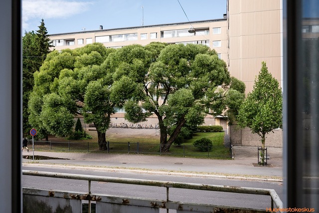 - kaupunkinäkymää, sisäpiha, kulmahuoneisto, ikkunat aukeavat pohjoinen-etelä-länsisuunnassa.