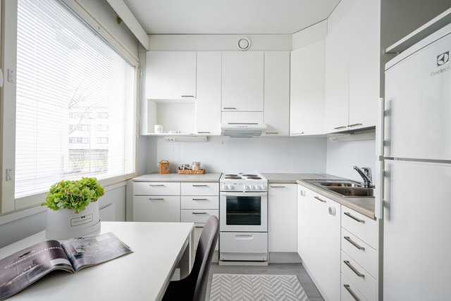 - Kaunis vaalea keittiö remontoitiin vuonna 2018 linjasaneerauksen jälkeen (Ideal keittiöt), Keittiön varustelua parannettiin vuonna 2020. Kahdella seinustalla kaappitilaa sekä mukavasti tilaa ruokapöydälle, Varusteluna: liesi (2013), liesituuletin, jääkaappi-pakastin (2020).